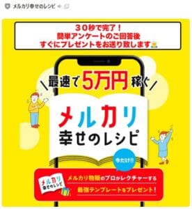 メルカリ幸せのレシピはフリマサイトのメルカリを利用して稼ぐ副業なんだけど、不用品を上手に売る為のテンプレートなんかを教えてくれてるみたいね。